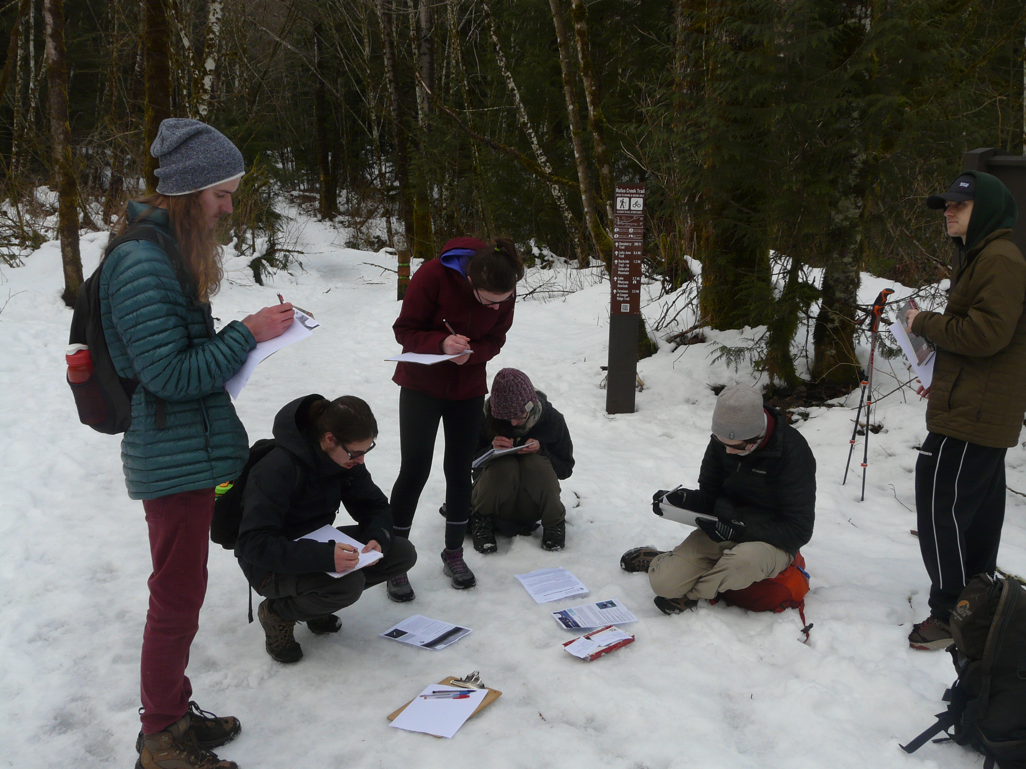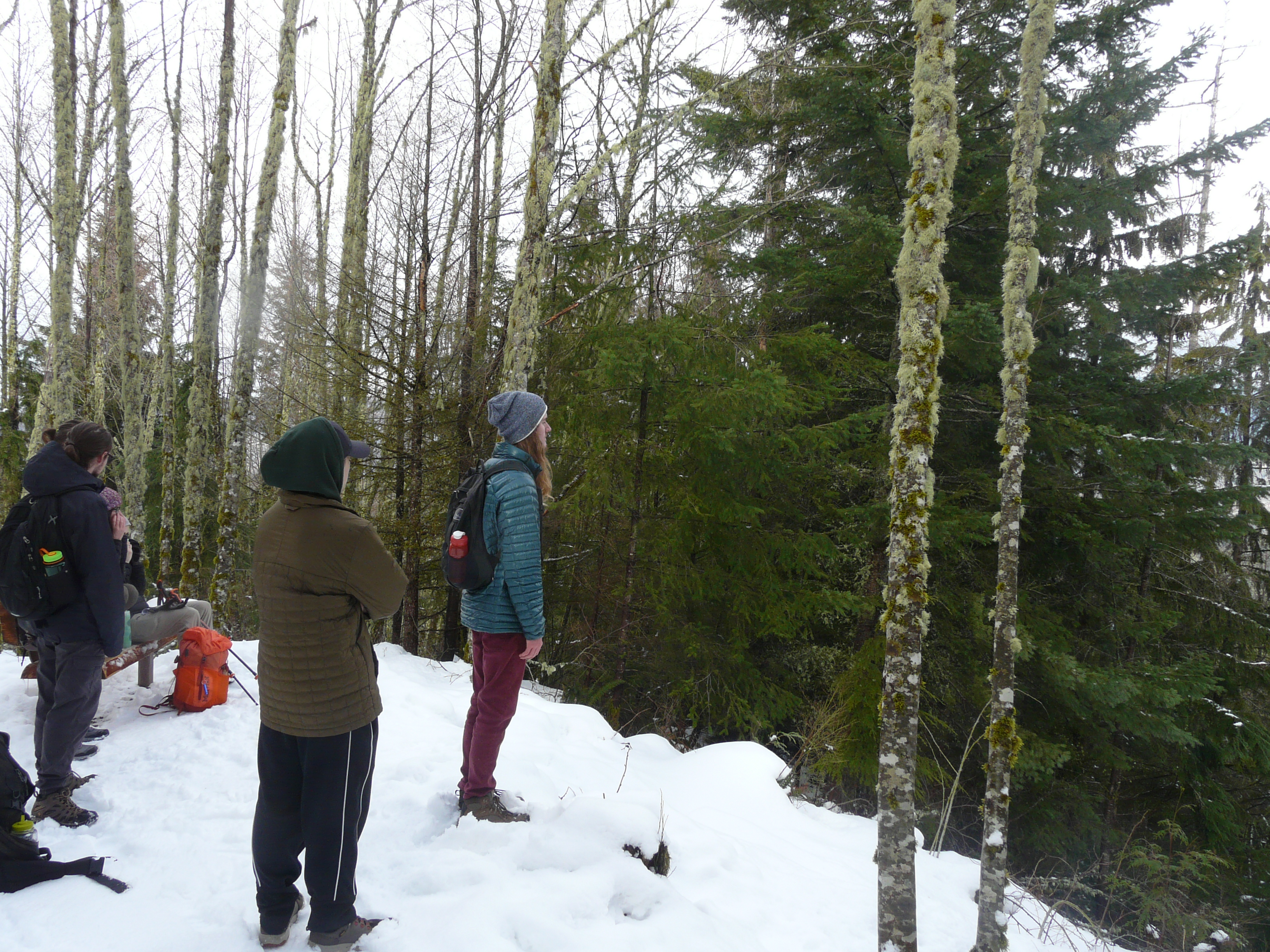 We paused on the trail for lunch and an interactivity activity that facilitated conversations about how we encounter nature and the “natural” world throughout the course of our lives. As we climbed higher the snow on the trail grew deeper, until we were hiking through a true winter landscape which looked utterly different from what we’d left behind in Bellingham. We emerged from the trees onto the Lookout Mountain Overlook with a view of Lake Whatcom and the hills beyond.