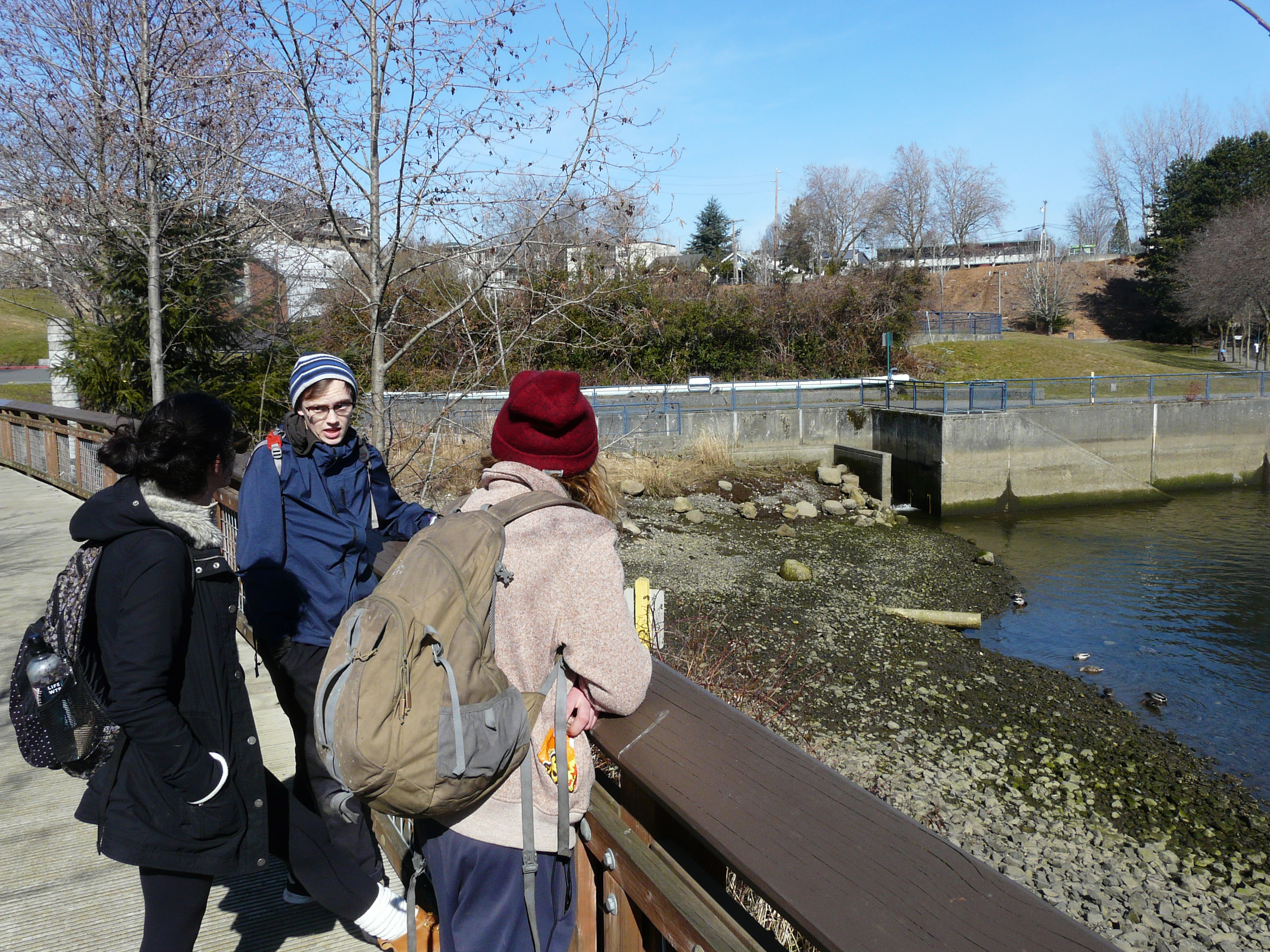 We next walked up into Maritime Heritage Park itself, a small urban park located where Whatcom Creek enters the bay. We stopped by a western red cedar and talked about the Lummi’s many uses of this tree, including everything from building cedar log canoes to making highly sophisticated fishing nets from cedar bark. This was followed by a conversation about cultural appropriation and when it is or is not respectful to use Indigenous art and imagery in public places (hint: the key is building authentic partnerships with Indigenous artists).