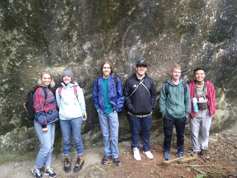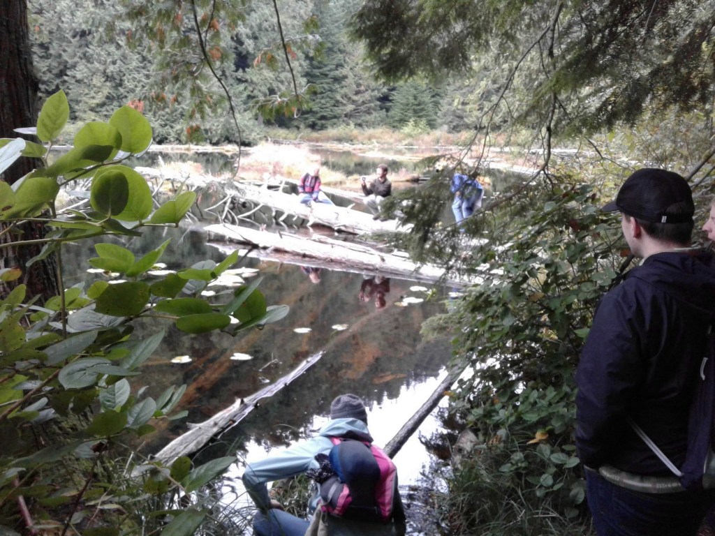 As we approached Lost Lake our group also stopped to appreciate one of the most impressive landscape features in this area: the immense Chuckanut Sandstone cliff formations. We looked up at these cliffs composed of compressed marine sediments that accumulated over the course of millions of years. Today the Chuckanut Sandstone shelters a variety of lichens that grow in the open rock face, and are a great place to look for fossils of ancient plant life.
