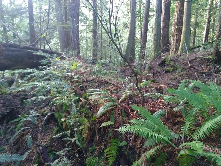 We met at the trailhead, several of us having taken the 512 bus from downtown Bellingham that conveniently stops right across the street. We then followed a route that took us in a loop through forest cover of varying ages, including groves where the enormous, old Douglas-firs stand.